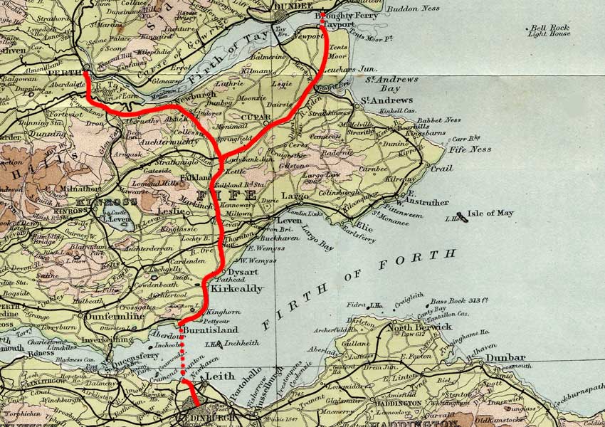 The train ferries (which conveyed goods wagons) and passenger ferry boats crossed the Firth of Forth from Granton to Burntisland. From 1850 to 1890 this was part of the main East Coast railway line to Perth, Dundee and Aberdeen. Most of the passengers who died in the Tay Bridge disaster in December 1879 had travelled by this route a few hours previously, and directors of the North British Railway used the same route in the early hours of the morning to visit the site of the disaster.